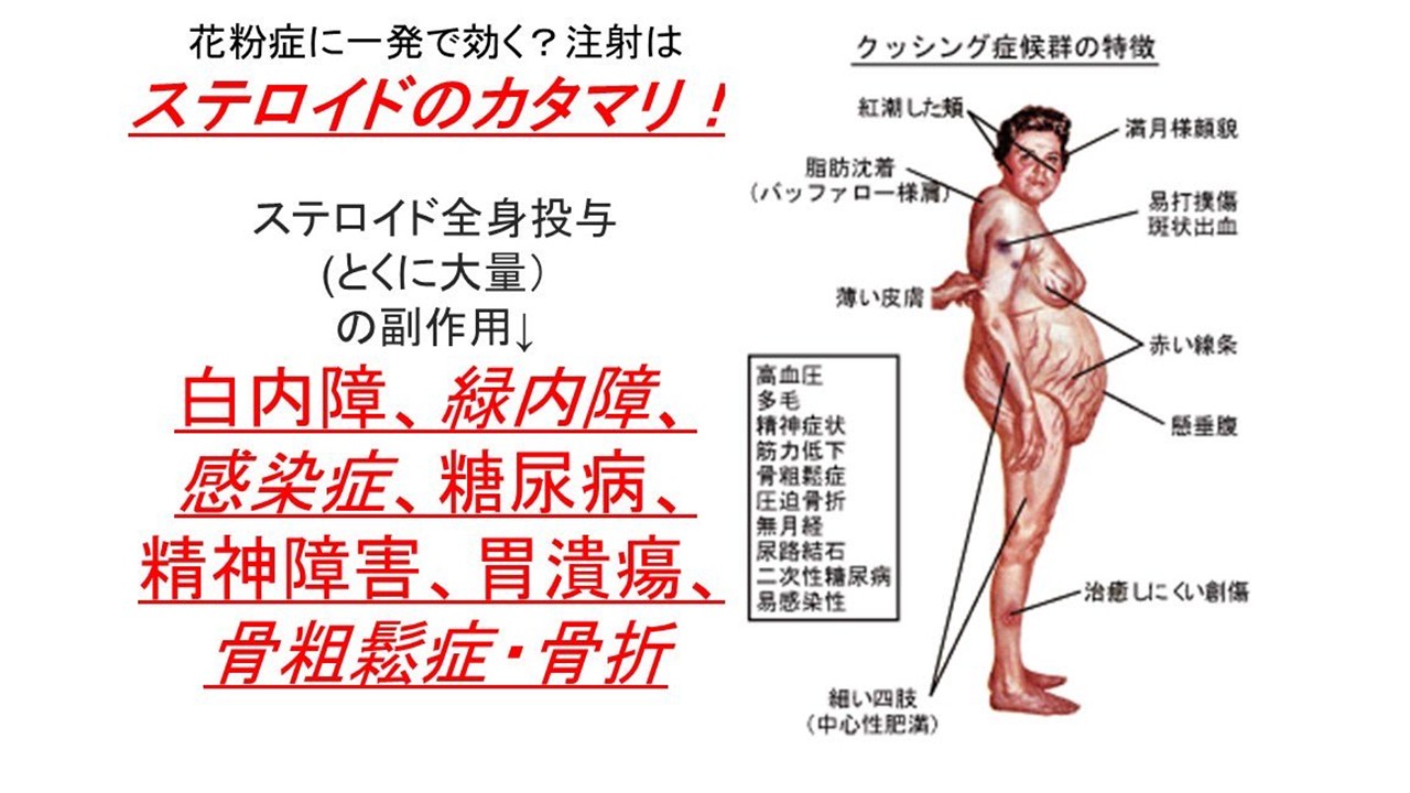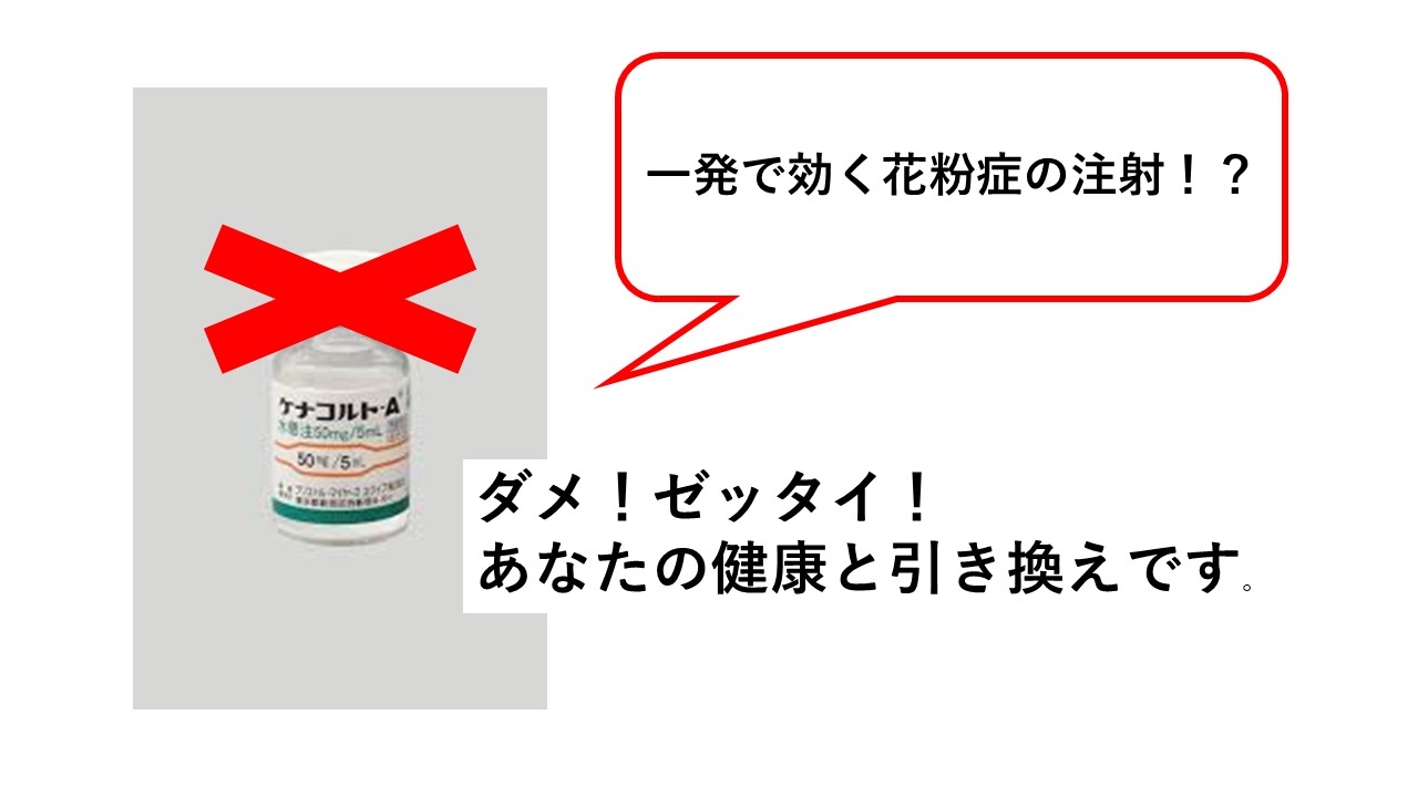 ズバリ、『ケナコルト』の事と思いますが、身体に毒になるステロイドの塊の注射です。使用しないことをおススメいたします。花粉症に対して使用しているところもあるようですが、あなたの身体の健康を害します。相手は責任をとってくれません。骨粗しょう症、糖尿病、胃潰瘍、白内障、緑内障、などなど、副作用は多岐にわたります。